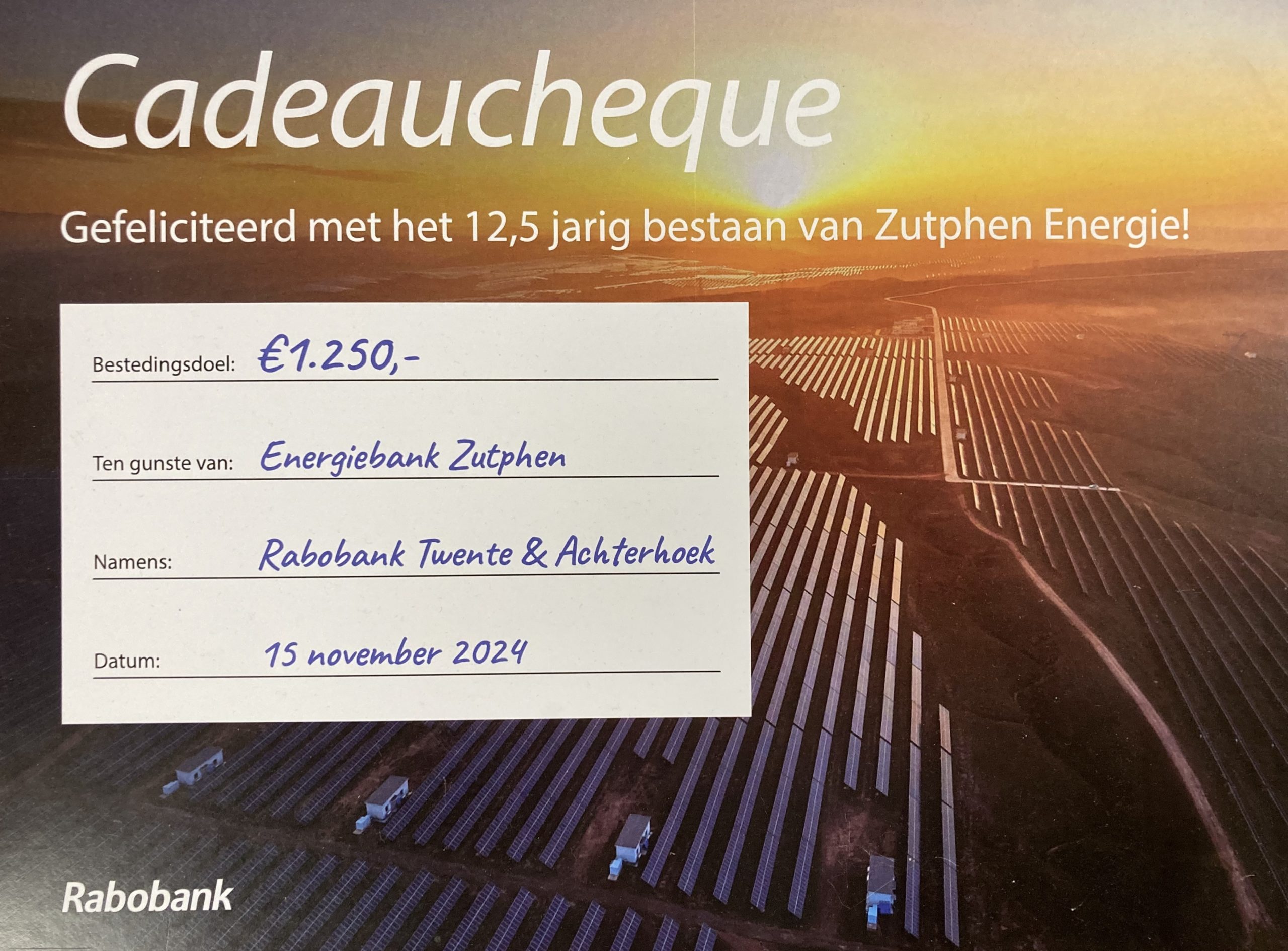 Ook Energiebank Zutphen geniet nog na van het jubileumfeest op 15 november 2024 van ZutphenEnergie. Rabobank Twente & Achterhoek: